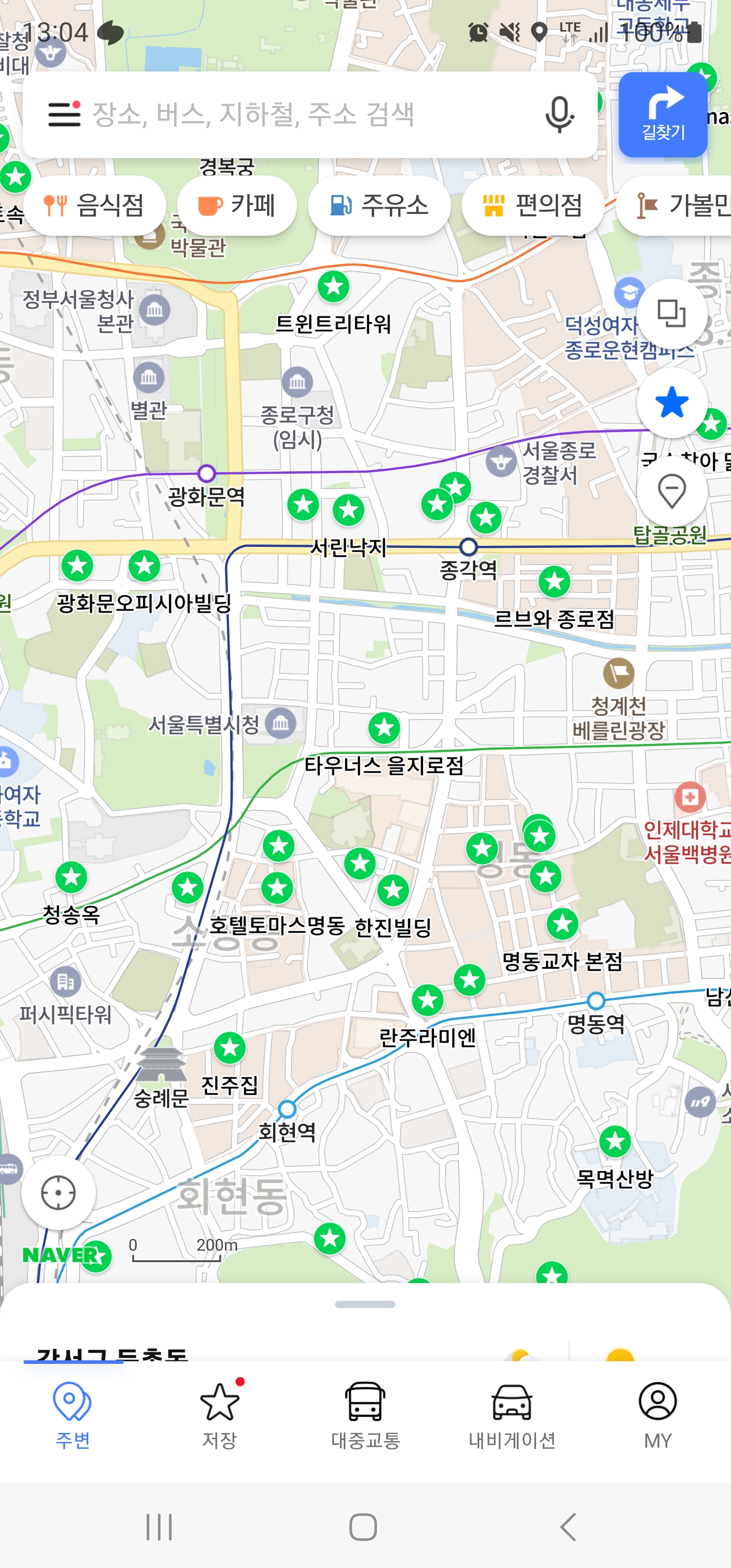 그 주변에 내가 평소 즐겨찾기 해두었던 장소들이 별 표시되어 보인다.